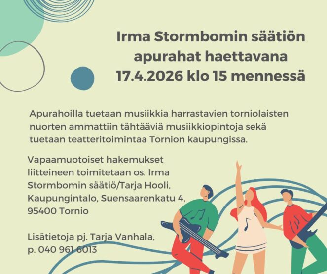 Irma Stormbomin säätiön apurahat ovat haettavissa. Apurahoilla tuetaan musiikkia harrastavien torniolaisten nuorten ammattiin tähtääviä musiikkiopintoja sekä tuetaan teatteritoimintaa Tornion kaupungissa.