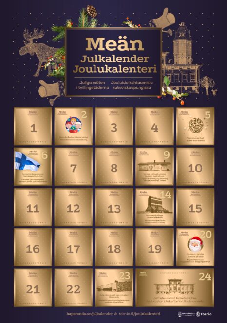 - Meän Joulukalenteri Julkalender avataan puheella ja yhteislaululla klo 13.00 (Suomen aikaa) Haaparannan Kaupunginhotellin edustalla.