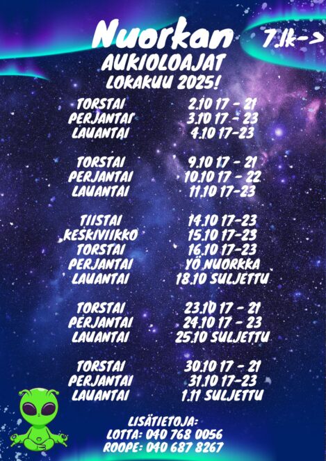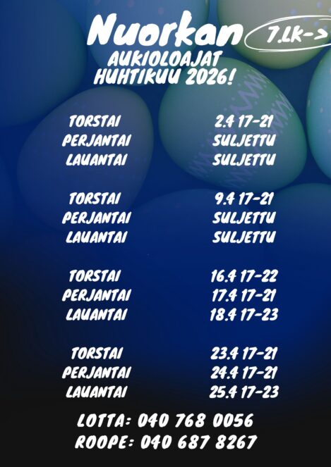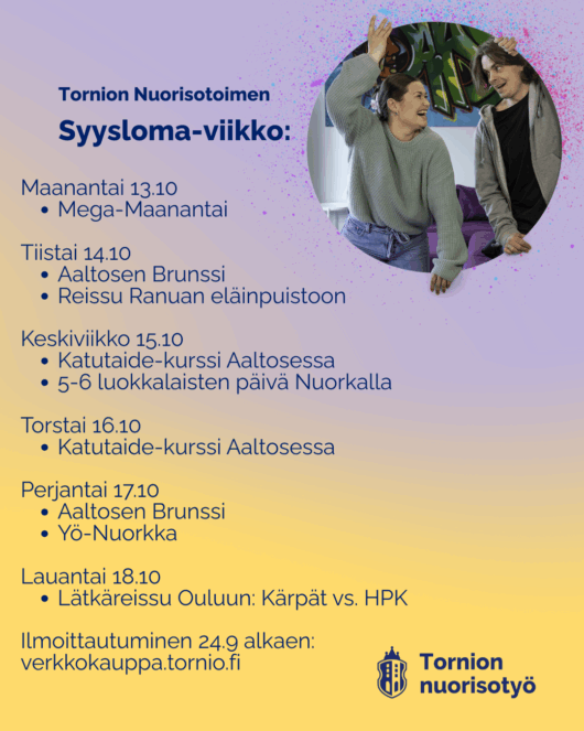 Ilmoitamme poikkeuksista aukioloajoissa Tornion nuorisotoimen Facebookissa ja Instagramissa.