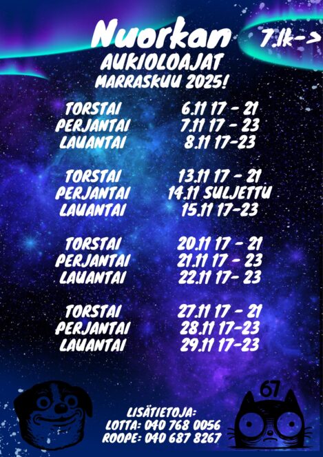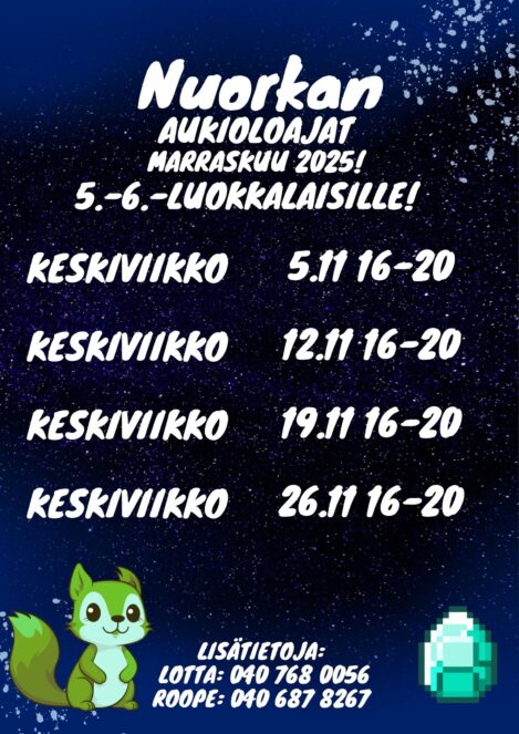 - Perjantaisin ja lauantaisin klo 17-23, 7.-luokkalaisille ja sitä vanhemmille