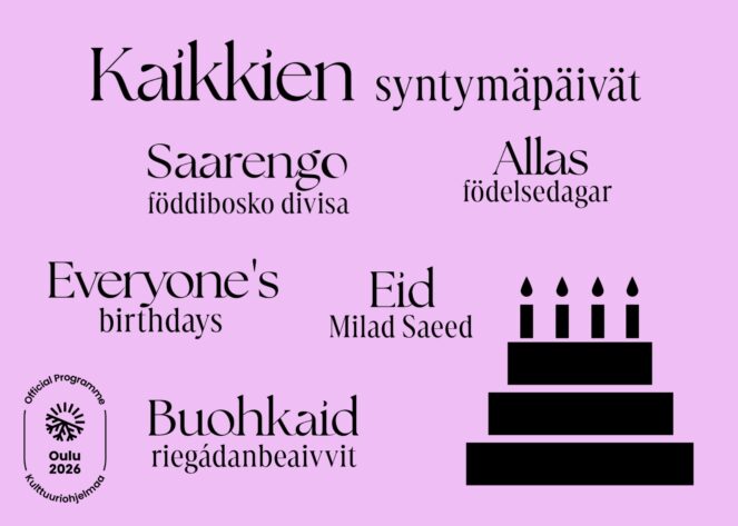 Helheten Allas födelsedagar (Kaikkien syntymäpäivät) firar Aines konstmuseums fyrtioåriga historia genom att föra konst, kultur och deras skapare till både konstmuseet och olika delar av tvillingstaden Torneå och Haparanda. Allas födelsedagar inbjuder alla att tillsammans fira Aines konstmuseum jubileumsår och Oulu2026, Europas kulturhuvudstadsår.